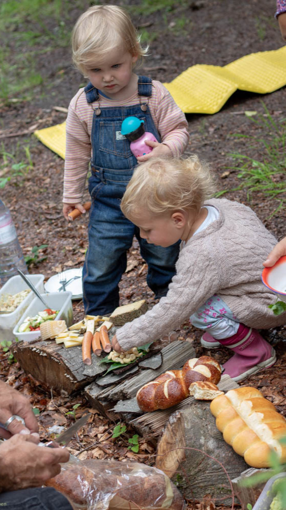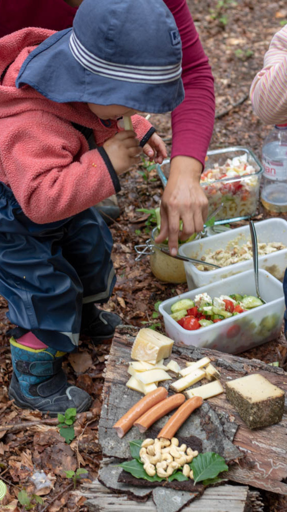 Hungrige Mäuler müssen erfahrungsgemäss so schnell wie möglich gestopft werden – also gibt’s zuerst grad eine Zvieri-Teilete. Alle haben dafür etwas Leckeres mitgebracht. Das Buffet wird dank Baumrinden, Moosplätze und Holzstämme amächelig hergerichtet, dass auch für die Augen was dabei ist. Die Kräfte und Energie kommen langsam wieder zurück und nun geht es ans aufbauen.