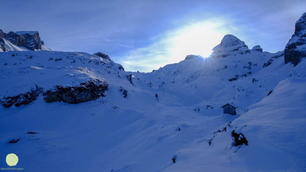 Mit dem schweren Gepäck fuhren wir mit der kleinen Seilbahn hoch und liefen ein paar hundert Höhenmeter durch die wunderschön verschneite Landschaft.