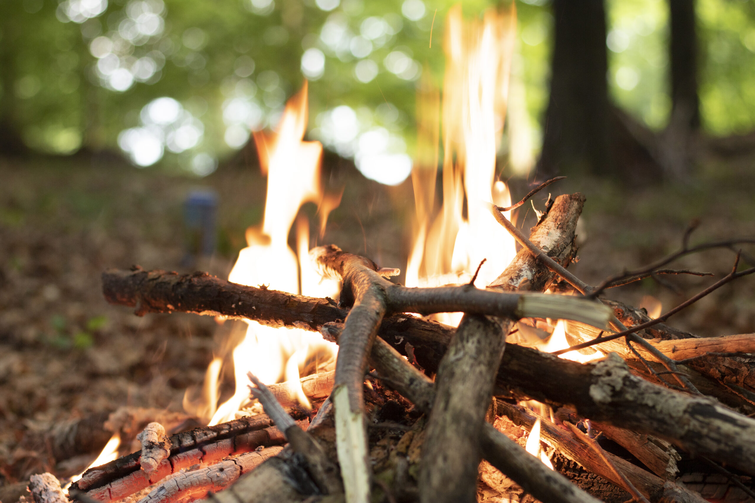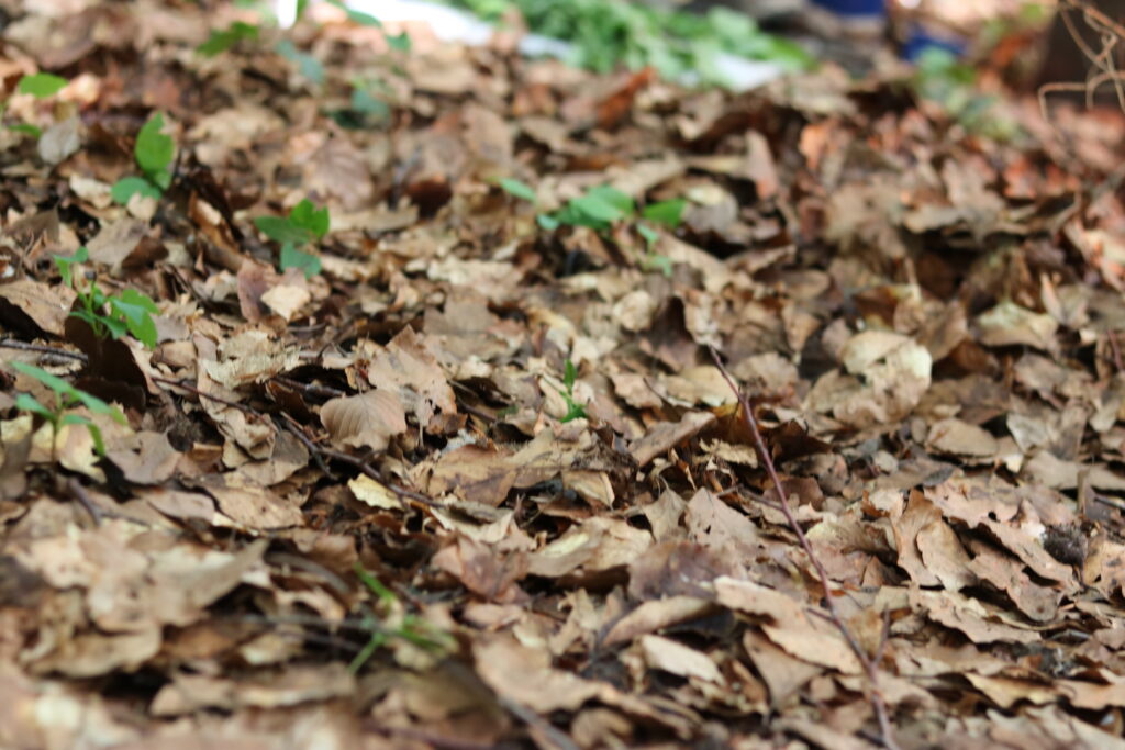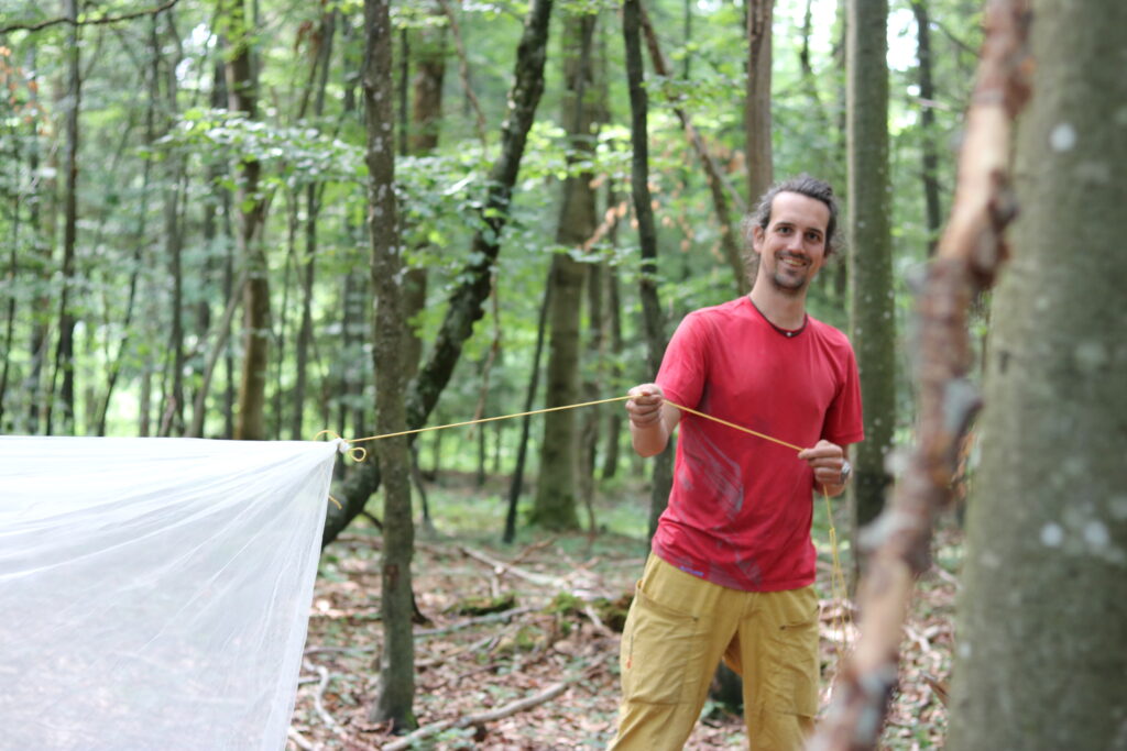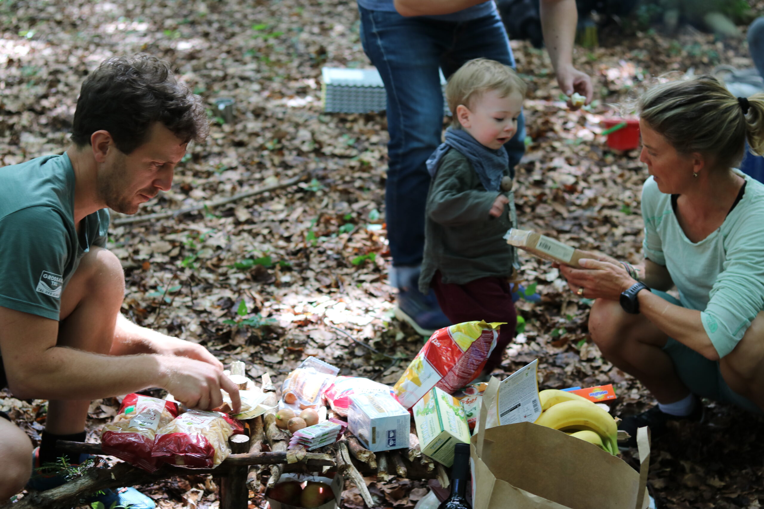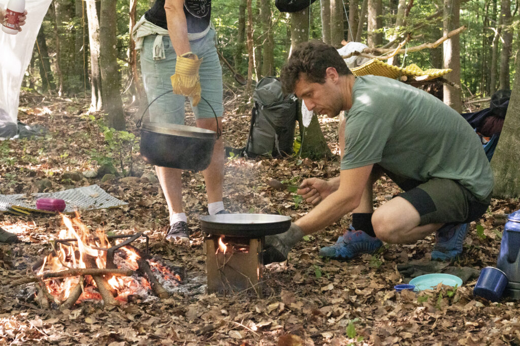 Zusammen mit den Kindern suchen wir uns unseren heutigen Schlafplatz aus, bauen die Tarps und Mätteli auf und beginnen Feuer zu machen. Es werden Feuerholz, Blätter und Stecken gesammelt und Seile gespannt. Bei den Schlafplätzen werden und im Esszimmer wird der Boden „gefegt“ und es wird wohnlich und gemütlich.