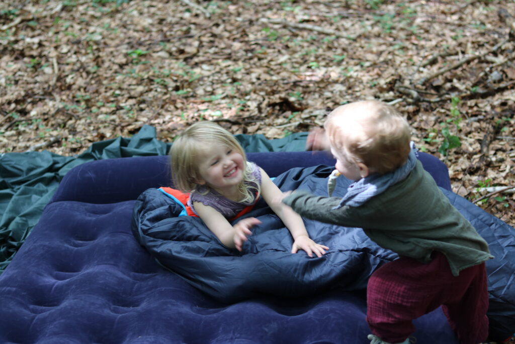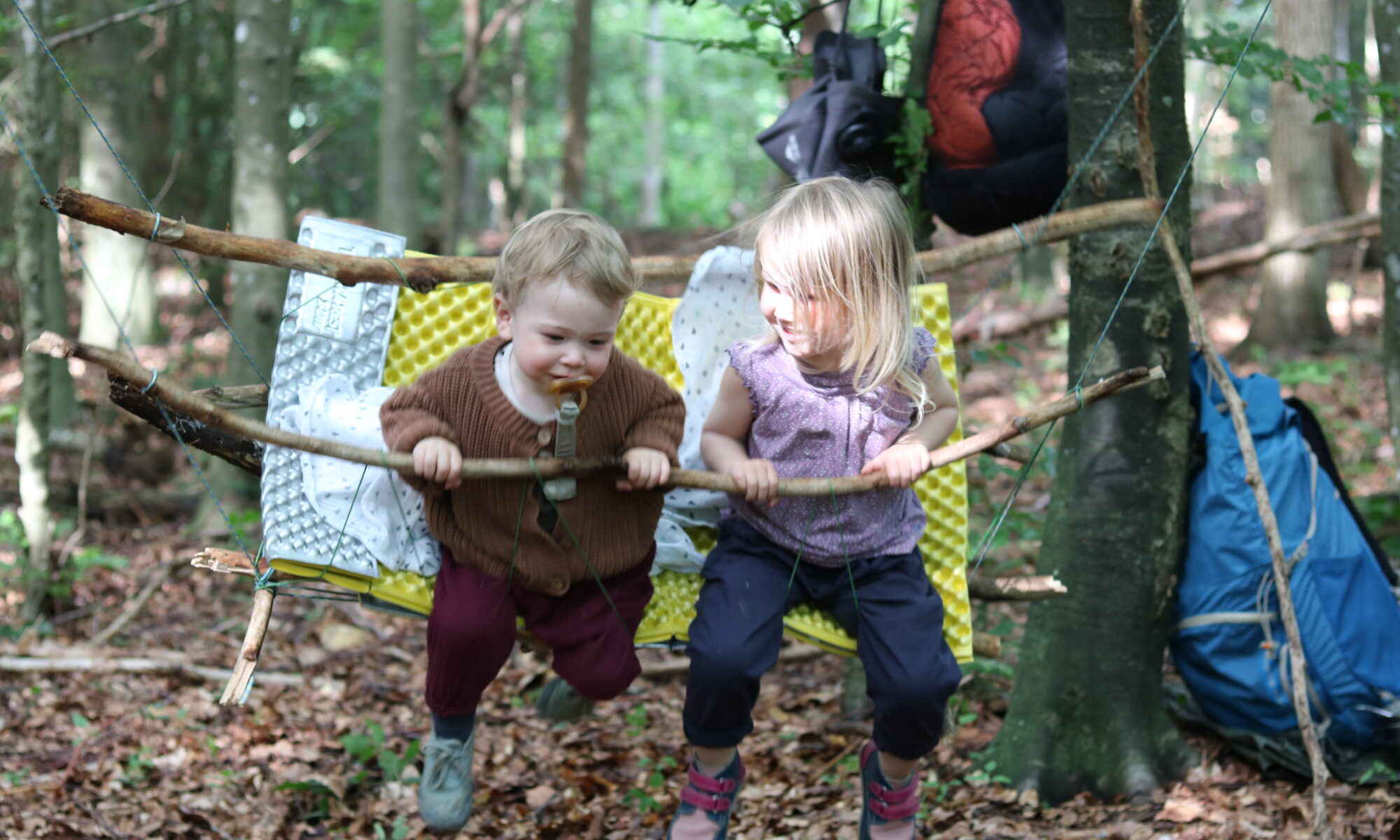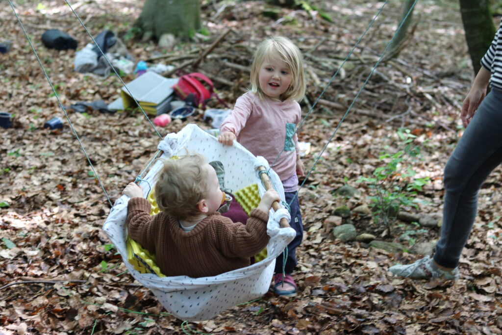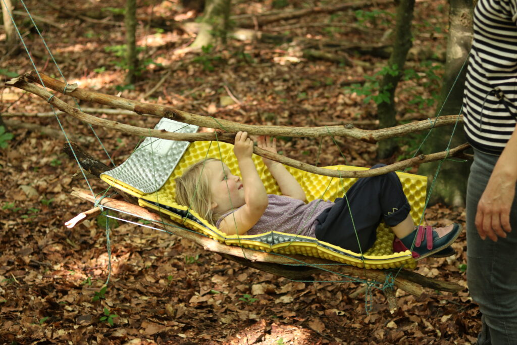 Kilian hat dann plötzlich die Idee, für die beiden kleinen Weltenentdecker eine Schaukel zu bauen. Es werden Äste gesammelt und zusammengebunden, zuerst mit einem Tuch ausgepolstert, was dann den Härtetest nicht allzu lang bestanden hat 😉 Die Z-Lite wird danach umfunktioniert und hält sogar die Doppel-Belastung aus 🙂 Ein Riesen-Highlight für die beiden!